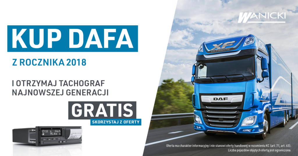 Przy zakupie używanego pojazdu marki DAF z rocznika 2018, otrzymasz tachograf najnowszej generacji zupełnie ZA DARMO!